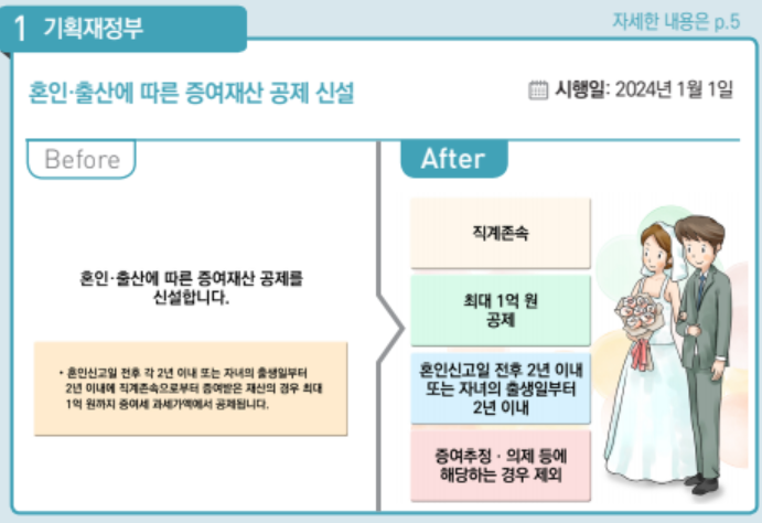 - 혼인신고일 전후 각 2년 또는 자녀의 출생일로부터 2년 이내에 직계존속으로부터 증여받는 재산은 최대 1억 원까지 증여세 과세가액에서 공제. (2024년 1월 1일부터 적용)