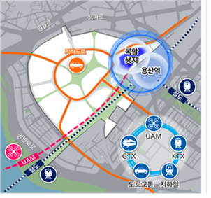 용산역과 인접한 부지에는 미래항공교통(UAM), GTX, 지하철, 도로 교통을 간편하게 환승할 수 있는 대중교통환승거점인 1호 '모빌리티 허브'를 조성하고, 미래항공교통(UAM)의 시범노선을 운영하는 계획도 있습니다.